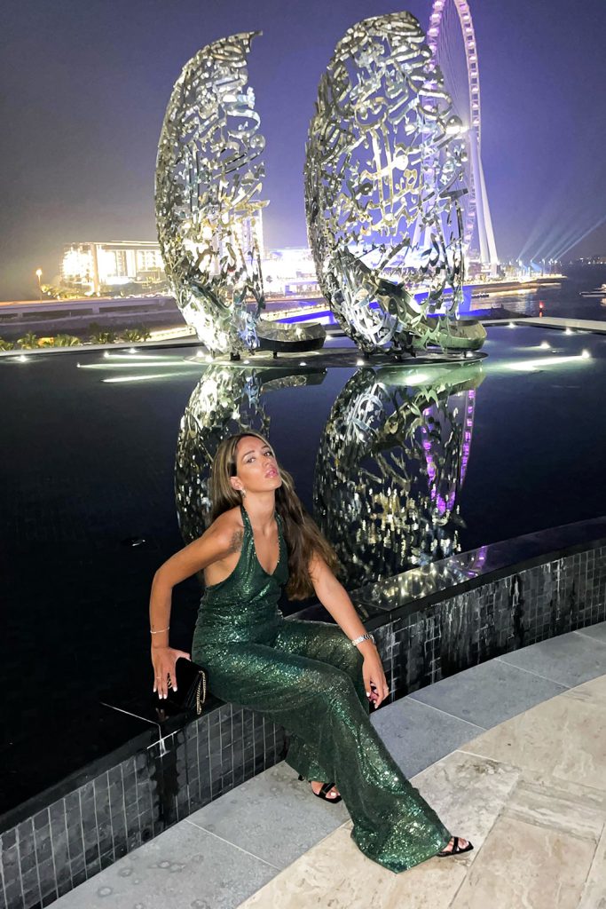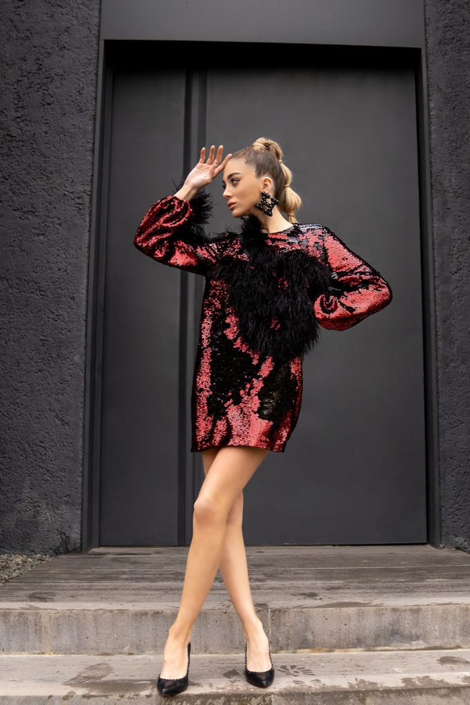 Blood Orange sequin mini evening dress long sleeves with feathered design in one sleeve and front