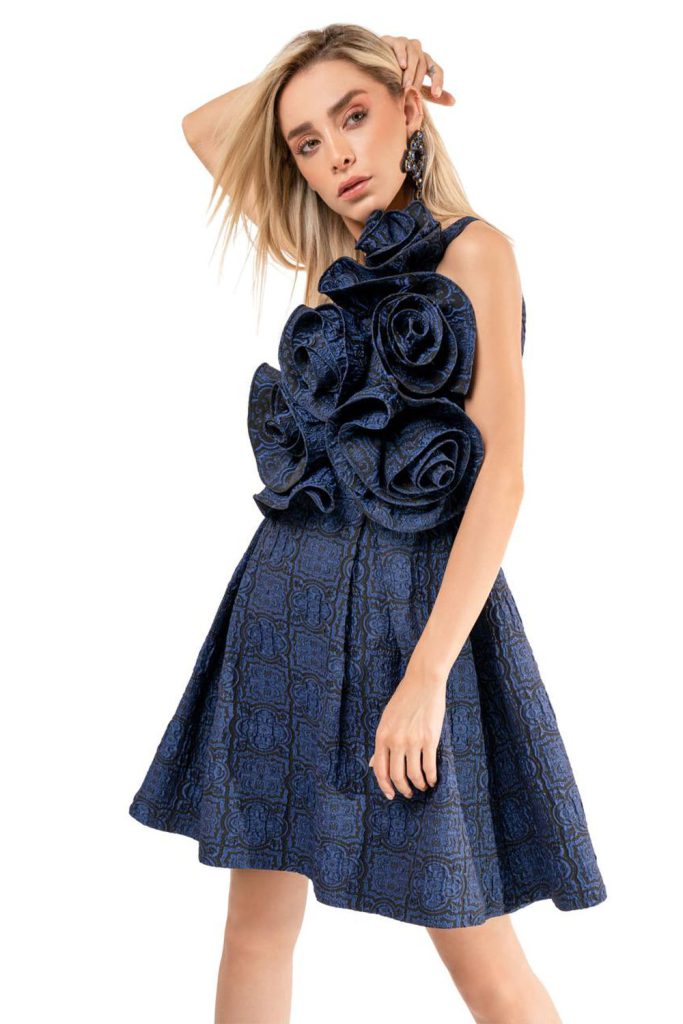 Blue/black fabric cocktail dress with bold pleats on top and flared shirt skirt