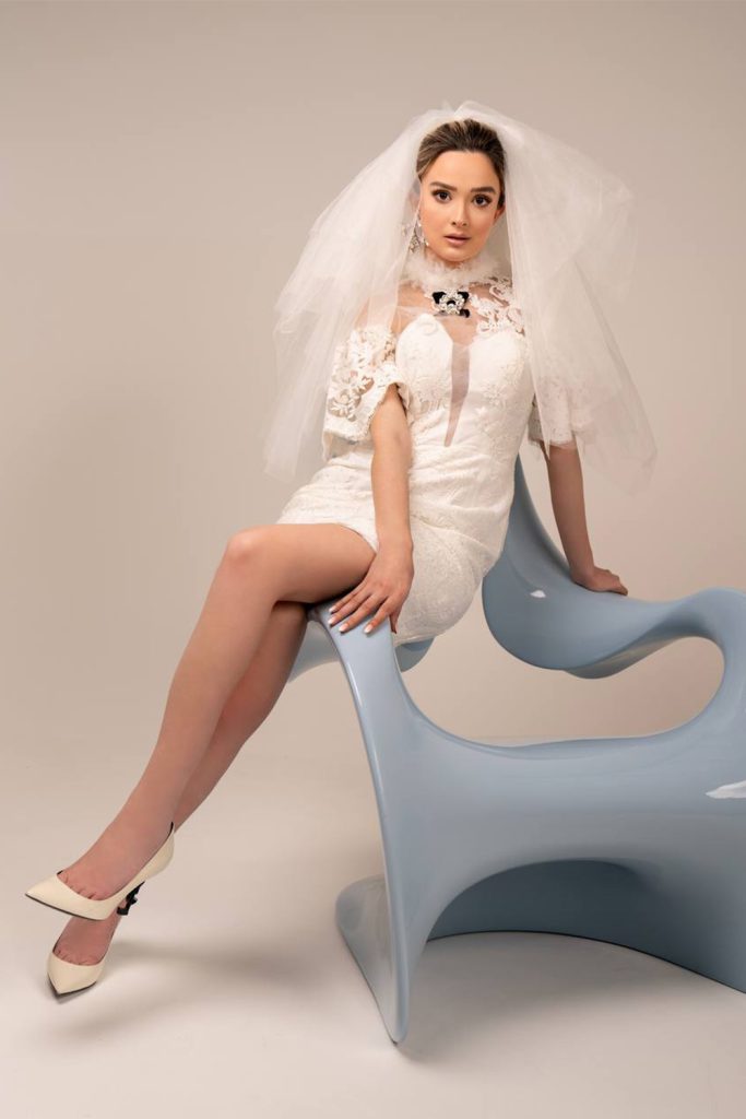 Short white lace cocktail dress- ruffled short collar and pleated short sleeves