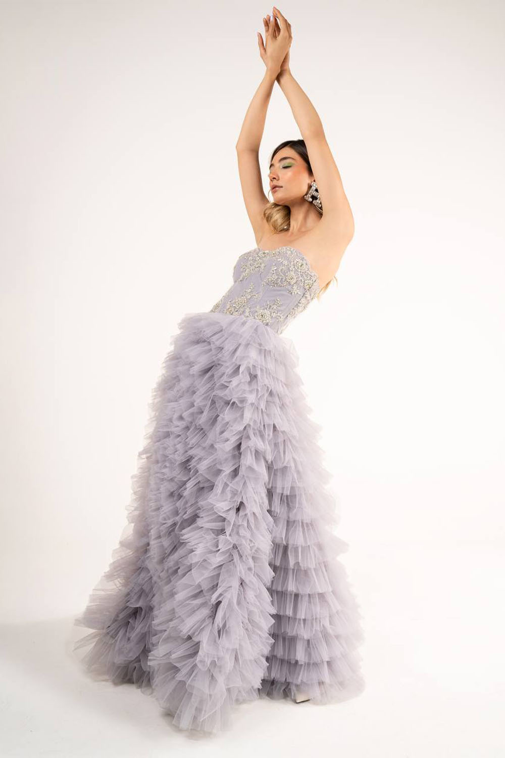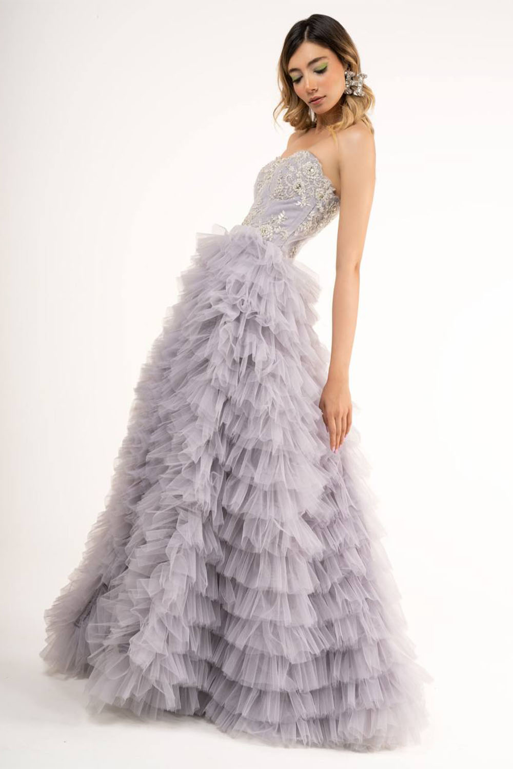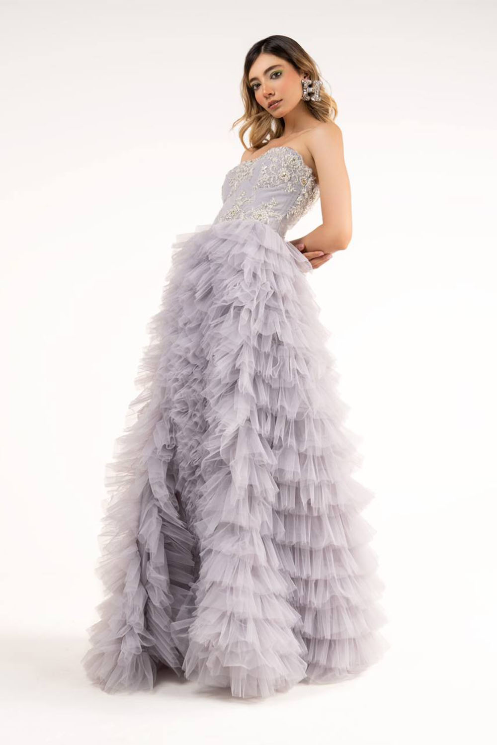 Bal long du soir gris robe perlée sur le dessus jupe longue à volants