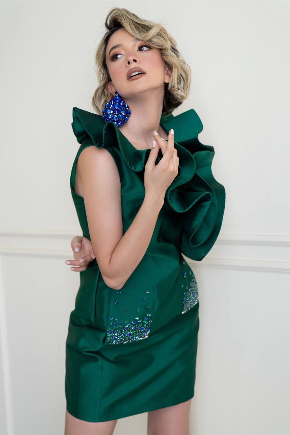 Dark green satin mini dress with ruffle curves on top – detailed stones in blue/green in front.