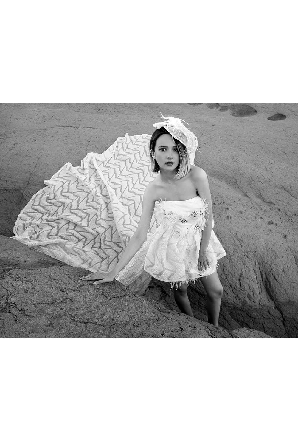 Robe de cocktail courte en dentelle blanche_col court volanté et manches courtes plissées