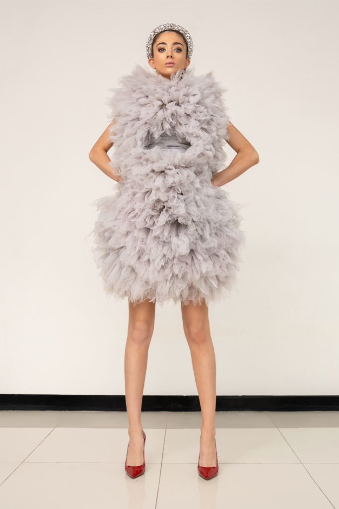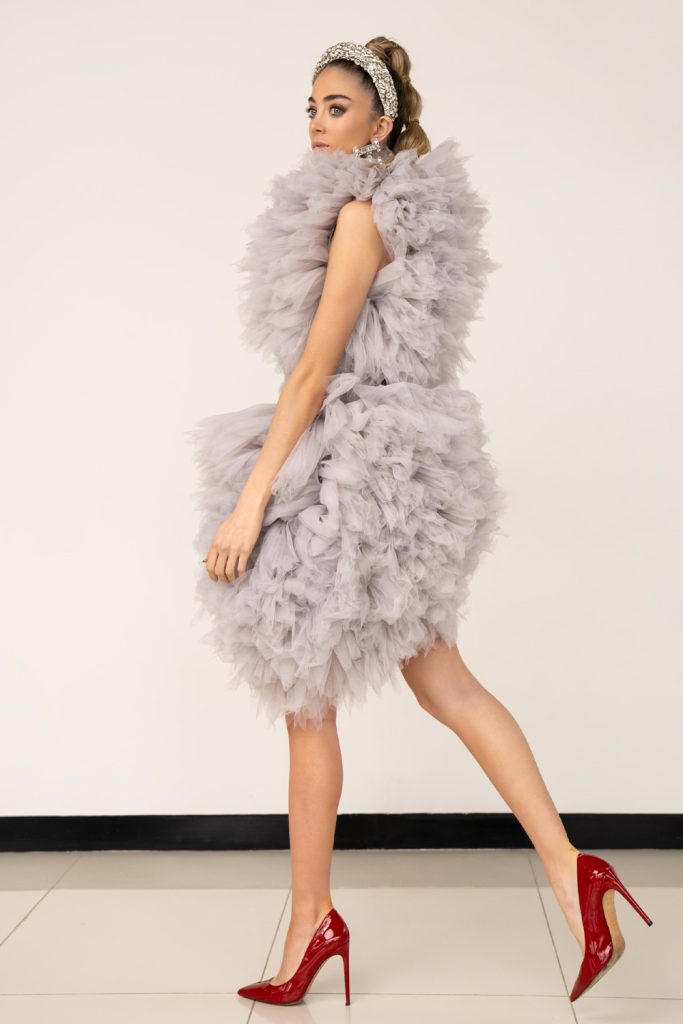 Robe de cocktail courte en organza à volants gris clair