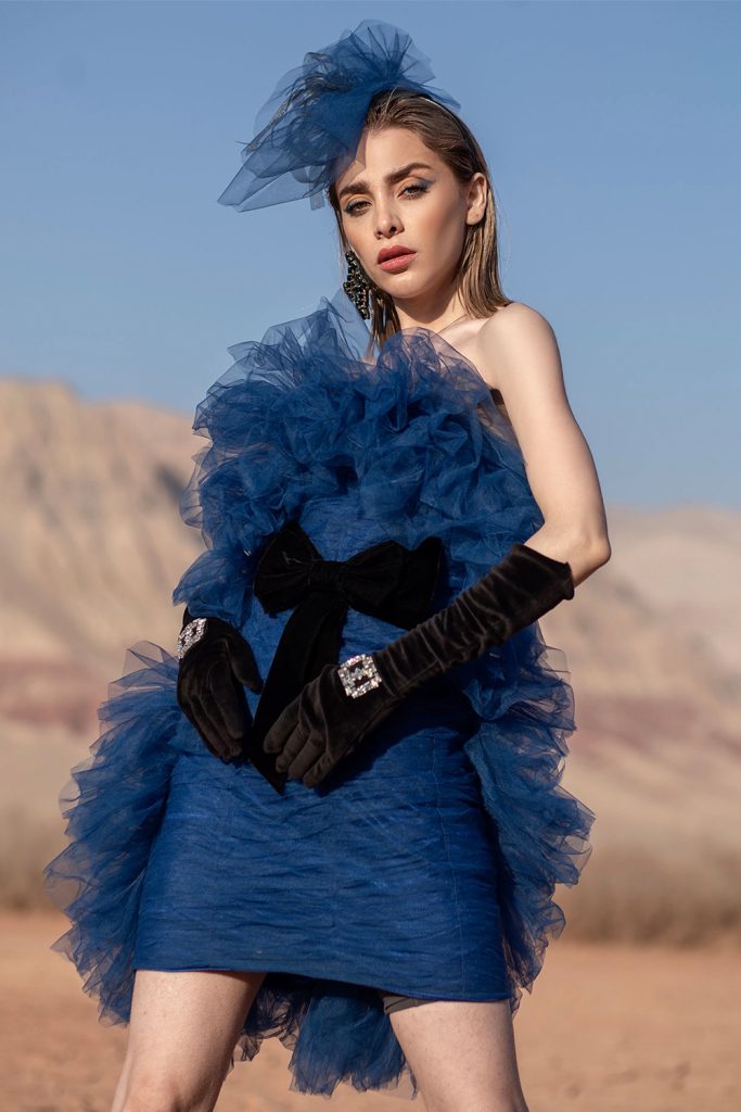 Robe de cocktail bustier en organza bleu,avec des volants sur le corps avec un nœud en velours noir sur le devanture