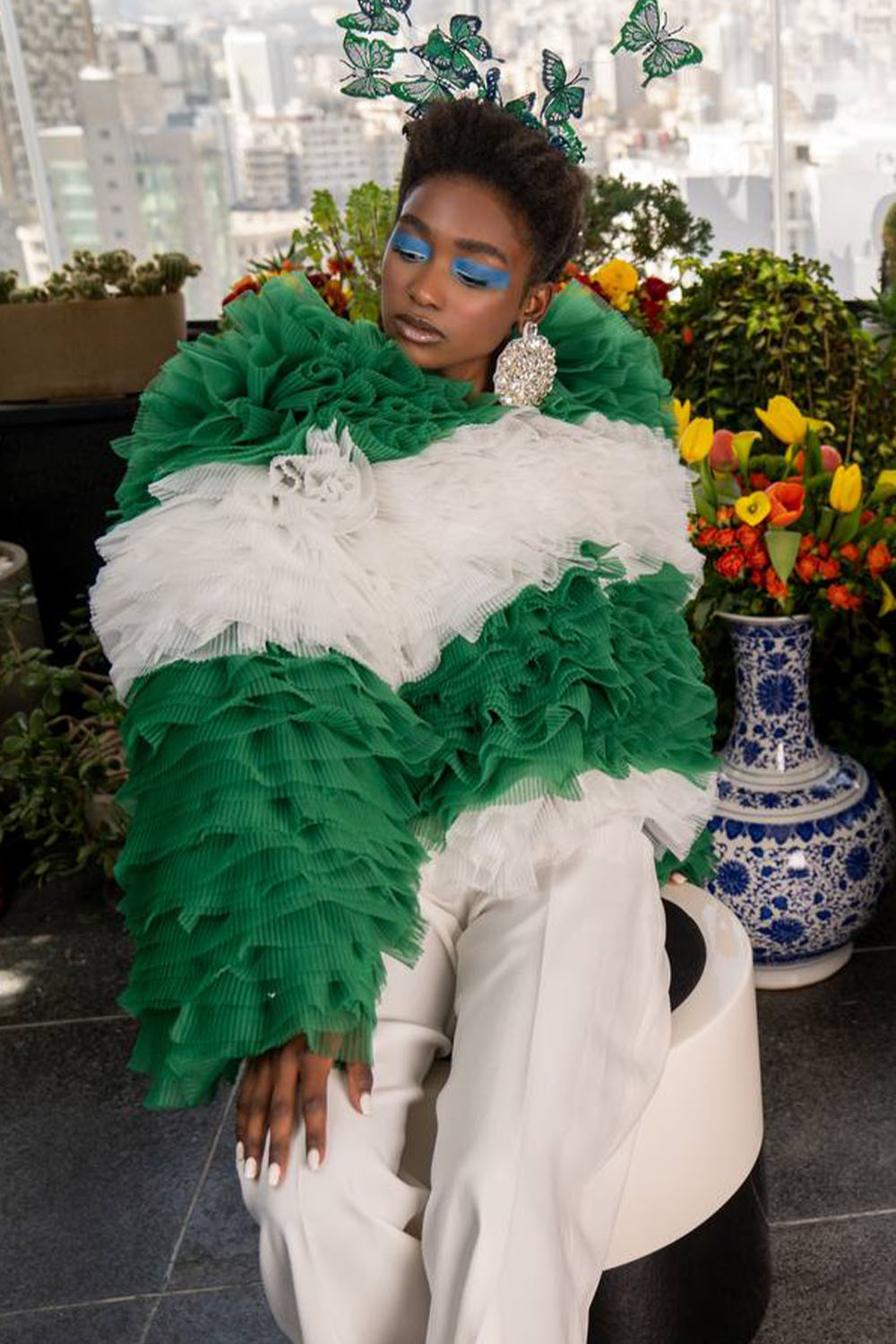HomeUncategorized Veste oversize plissée et volantée vert et blanc à manches longues et taille mi-haute