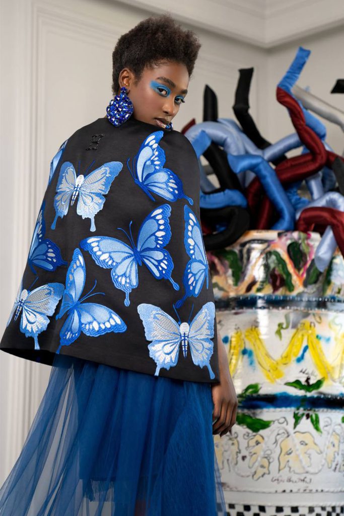 Veste taille mi-haute châle noir brodé papillon bleu